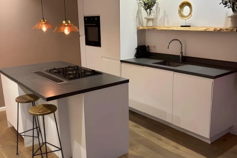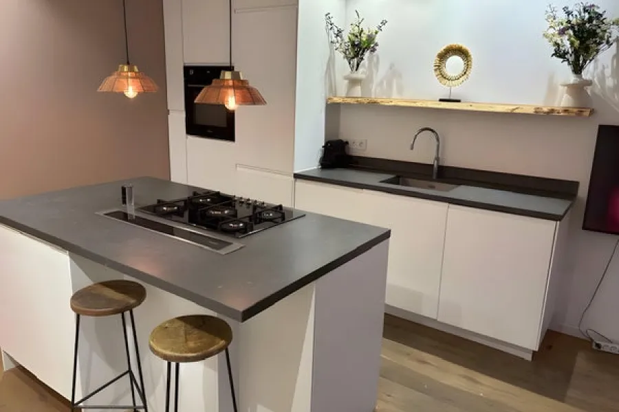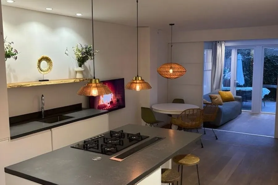 Ruime en lichte woonkamer met moderne open keuken, voorzien van alle inbouwapparatuur incl. cooker