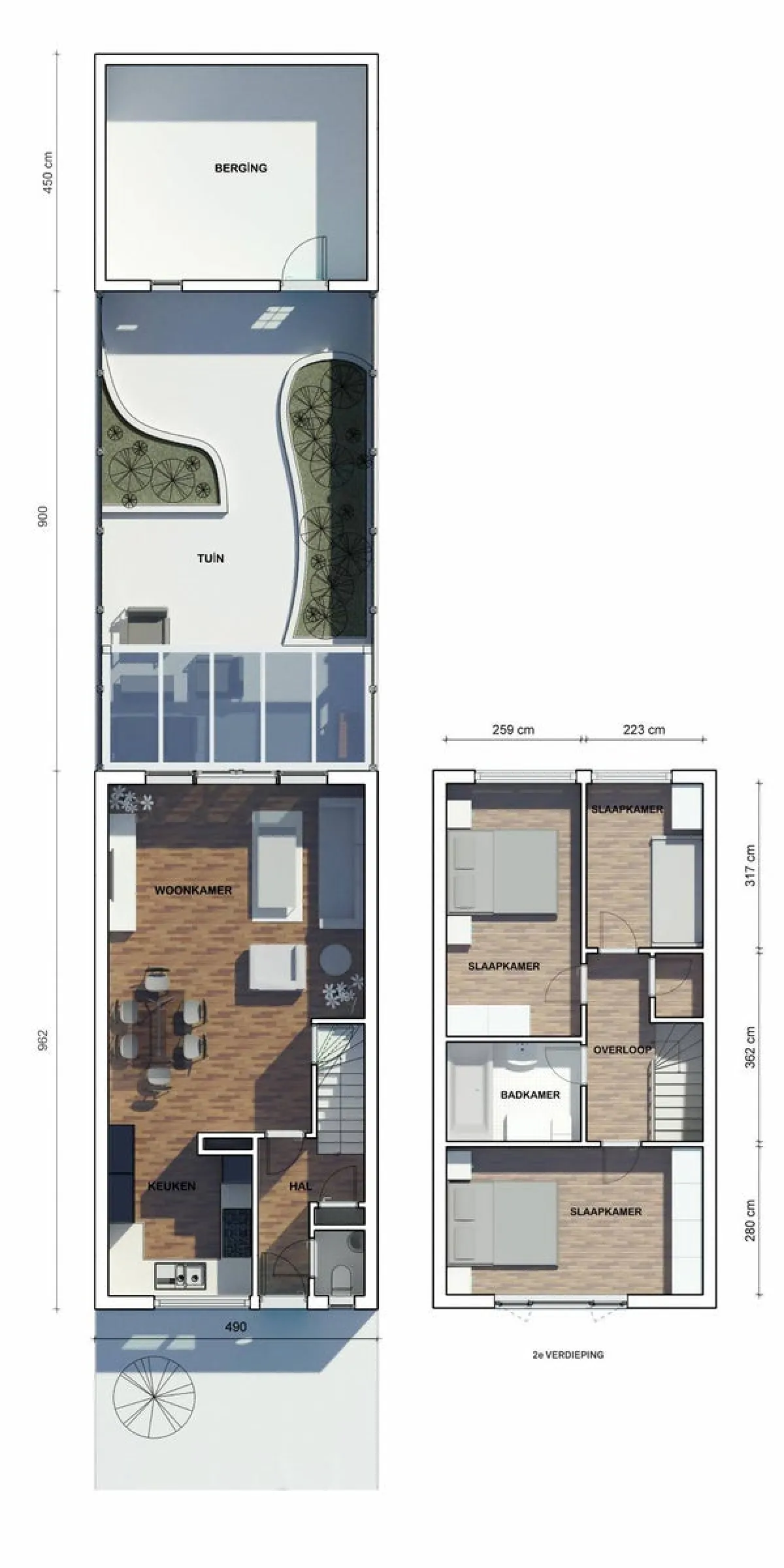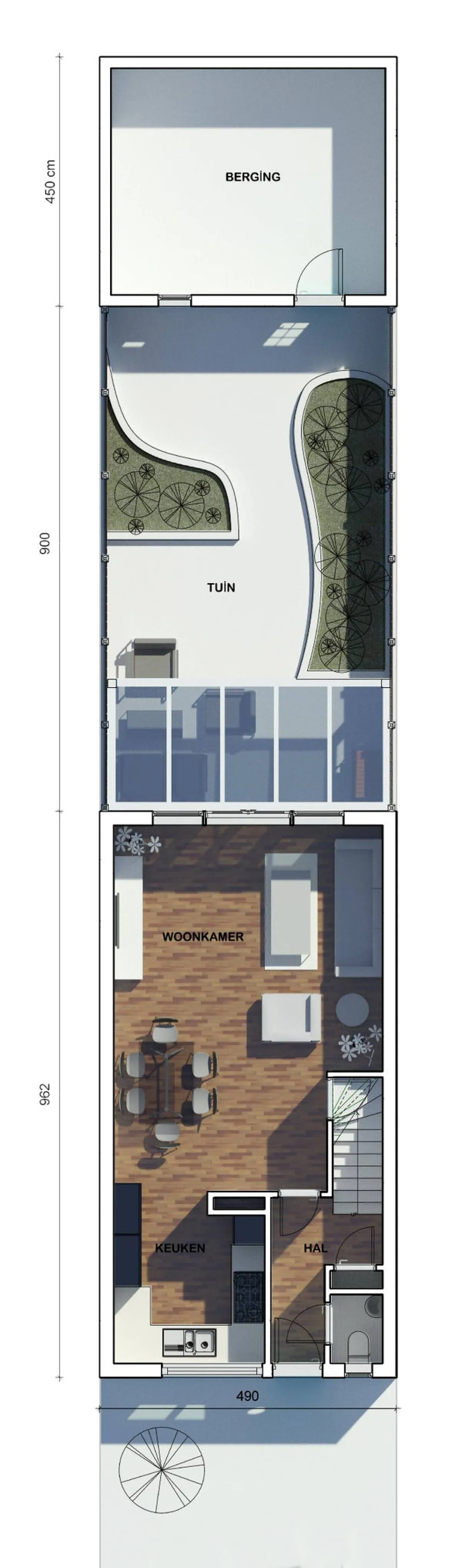 Op de begane grond bevindt zich een grote open keuken en ruime living met openslaande deuren naar de diepe achtertuin. De eerste meters van de achtertuin zijn overdekt, waardoor je ook op minder mooie dagen heerlijk van de tuin kan genieten. Achterin de tuin bevindt zich een schuur van 4,5 x 5 meter, tevens toegankelijk via de achterzijde, goed in te zetten als werkplaats, berging en/of fietsenstalling.