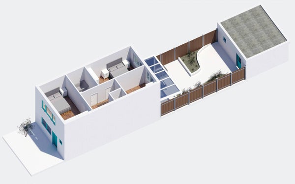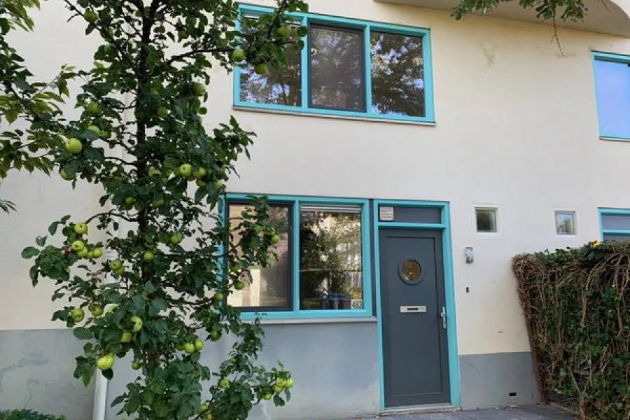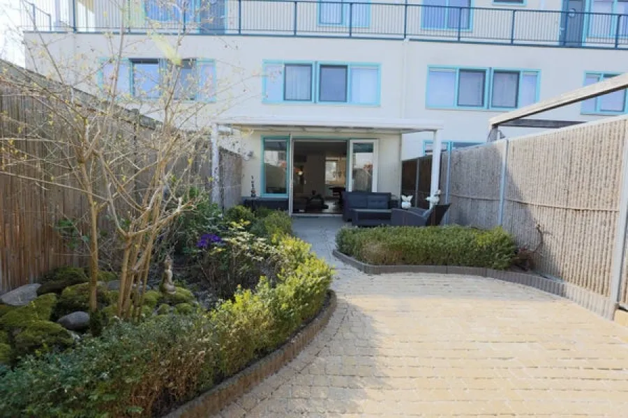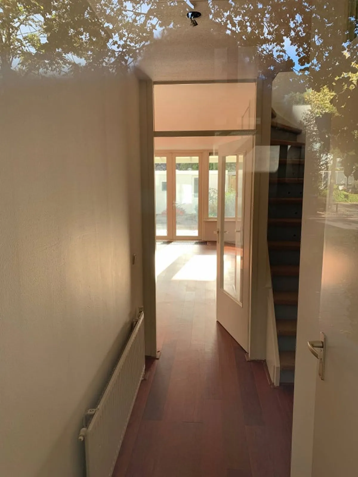 In de voortuin (17 m²) kan je genieten van de avondzon. Ook dit is een ruime en eigen buitenruimte, netjes betegeld met een gezellige uitstraling door een appelboom. In de hal op de begane grond bevindt zich een toilet met fontein, de meterkast en de trap naar de eerste verdieping. De onderzijde van de trap wordt efficiënt ingezet als voorraadkast, toegankelijk vanaf de woonkamer.