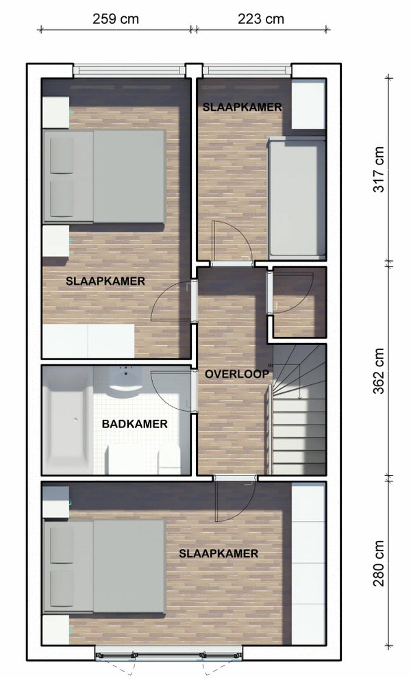 Via de gestoffeerde trap bereik je de eerste verdieping. De drie slaapkamers zijn licht en ruim (van 7 m² tot 13 m²) en grenzen allen direct aan de overloop. De badkamer is wit betegeld en beschikt over een wastafelmeubel, ligbad met douche, tweede toilet en opstelplaats voor wasmachine. De cv-ketel bevindt zich in een aparte opbergruimte.