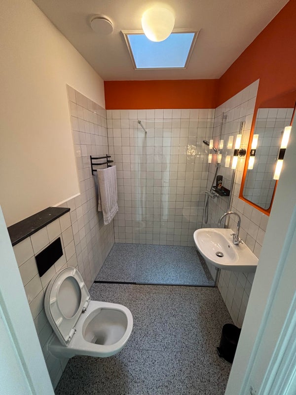 - Bathroom with a walk-in shower, sink, and toilet, plus an additional toilet in the hallway