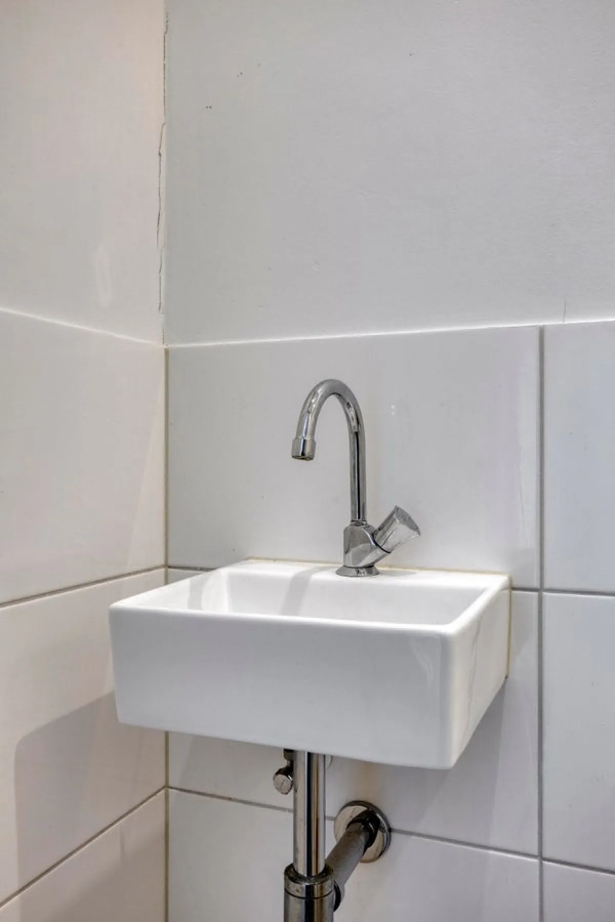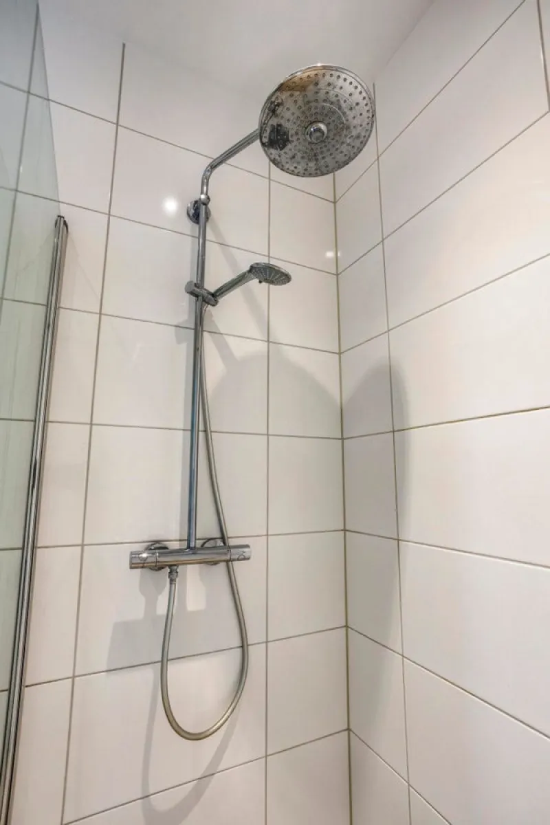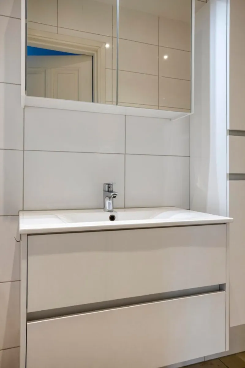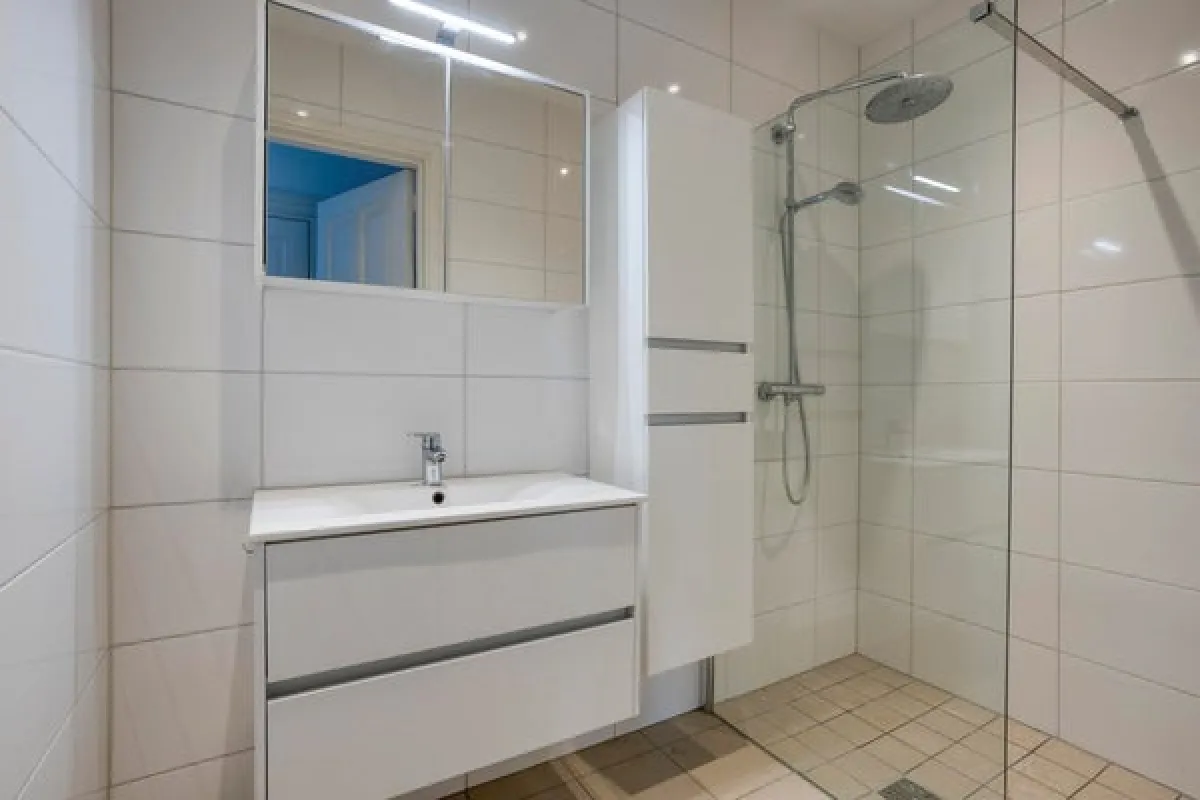 De badkamer is uitgerust met grote inloopdouche, wastafel met twee lades, een spiegelkast en een extra kast voor handdoeken. Naast de badkamer bevindt zich een losse toilet.