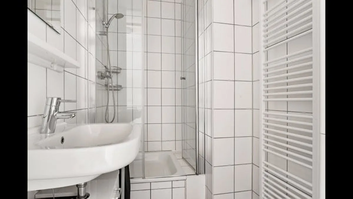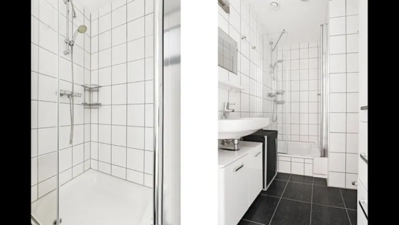 BathroomThe fully tiled bathroom features dark floor tiles and white wall tiles for a bright and spacious feel. It includes a washbasin with storage units, a designer radiator, and a separate shower cabin.