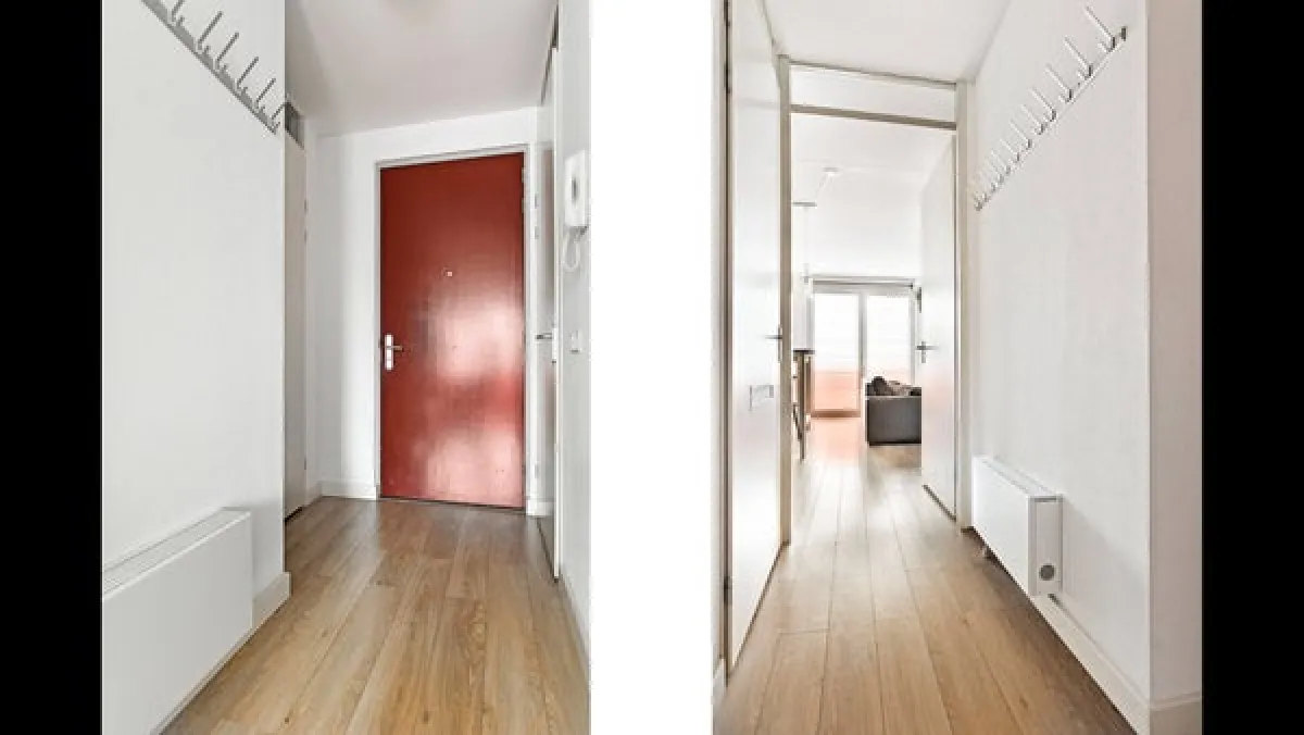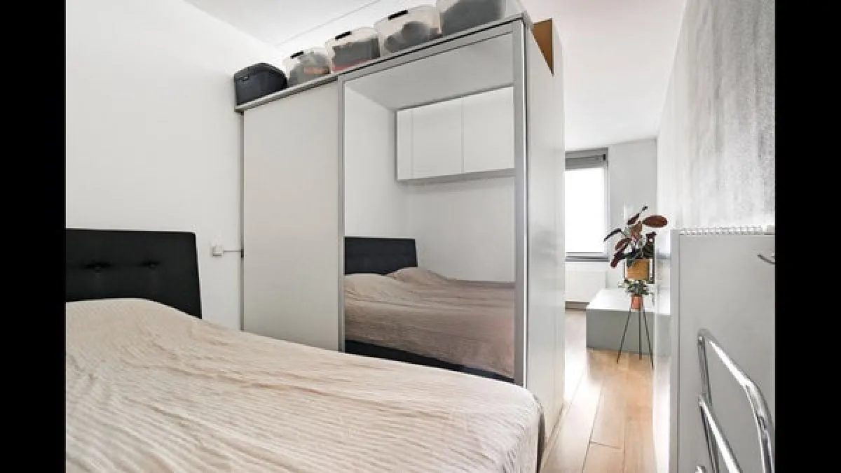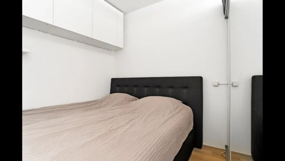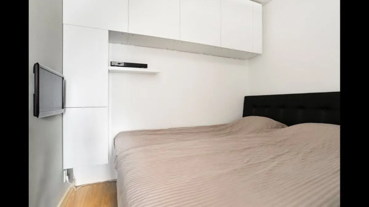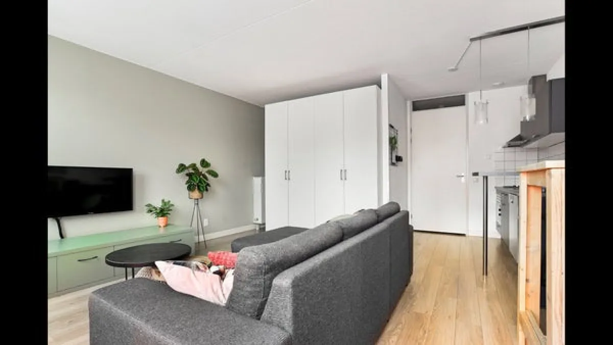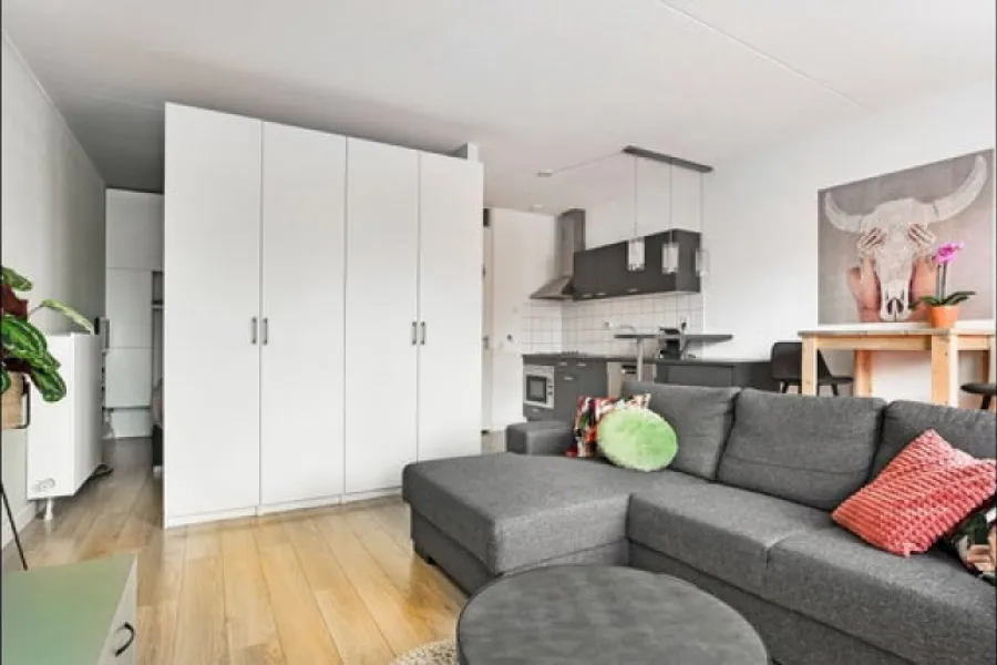 Living roomThe bright living area features French doors that open inwards, letting in fresh air and natural light. Thanks to the smart placement of a wardrobe wall, a separate sleeping area has been created, giving the impression of a two-room apartment.The apartment is neatly finished with a modern laminate floor and smooth plastered walls.