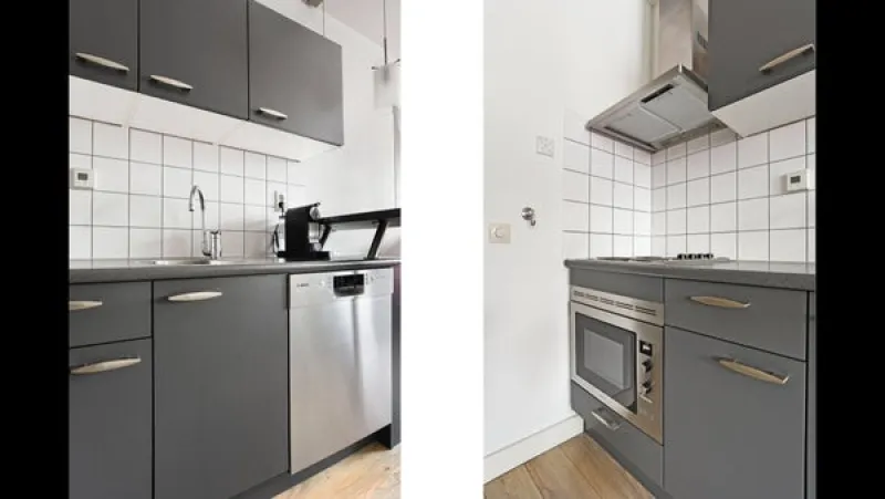 KitchenThe modern kitchen is fully equipped with an electric stove, extractor hood, combi microwave oven, refrigerator, freezer, and dishwasher. The dark cabinet fronts contrast beautifully with the light wall tiles, creating a clean and stylish look. Upper cabinets provide additional storage, and the space is efficiently designed for comfort and practicality.