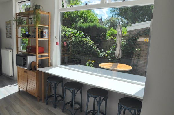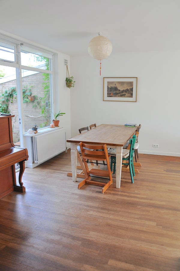 Ruime en lichte L-woonkamer met parketvloer. Groot raam met deur naar de tuin. Een piano, heerlijke zithoek en grote diner tafel, groot raam deur naar de achtertuin. De woonkamer is voorzien van kabelaansluiting voor (Ziggo) internet en digitale tv. De lichte, diepe keuken heeft comfortabel laminaat met vloerverwarming, een warmwaterboiler, een groot houten aanrechtblad met veel opbergruimte in de lades, 6-pits (gas)kookplaat, oven, vaatwasser, koelkast / vriezer, een wasmachine en een droger. Entreedeur (met kattenluikje) naar de achtertuin.