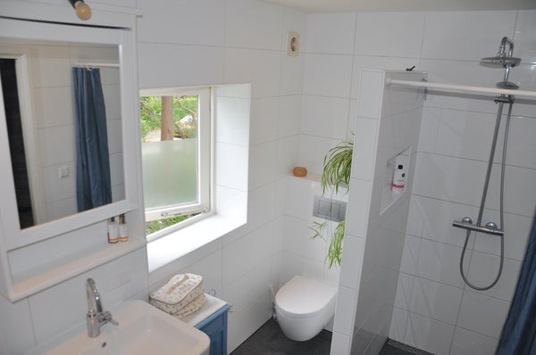 De ruime badkamer heeft zicht op de tuin en is voorzien van moderne tegelvloer en vloerverwarming, wastafel met spiegelkast, groot ligbad, inloop (stort)douche en toilet.