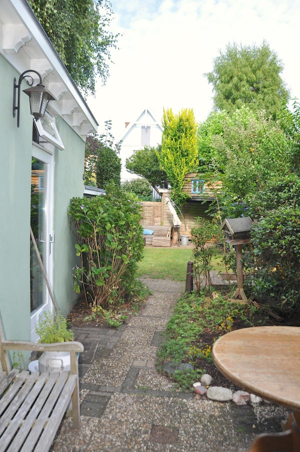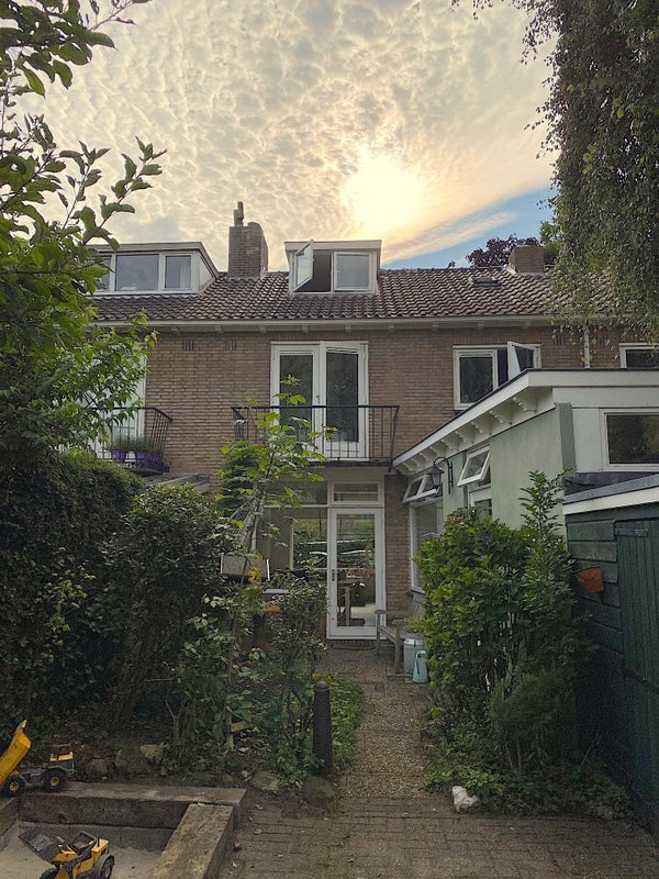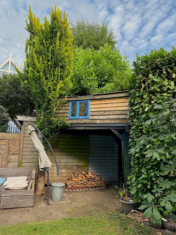 Ruime, diepe (19m) groene tuin met uitzicht op de prachtige Pippi Langkous huizen van de Sandtmanlaan. Veel beplanting, 2 zonneterrassen; 1 naast de keuken met houten bankje voor je koffie in de ochtendzon en een terras achterin de tuin met grote houten loungebank en houtkachel voor de zon overdag en in de vroege avond. Een kleine schuur met open berging en werkbank, een zandbak voor de kleintjes en een boomhut waar je kunt spelen en slapen met verborgen entree via de struik. Een mini-moestuin en een appelboom waaruit je kunt oogsten voor je eigen huisgemaakte appeltaart.