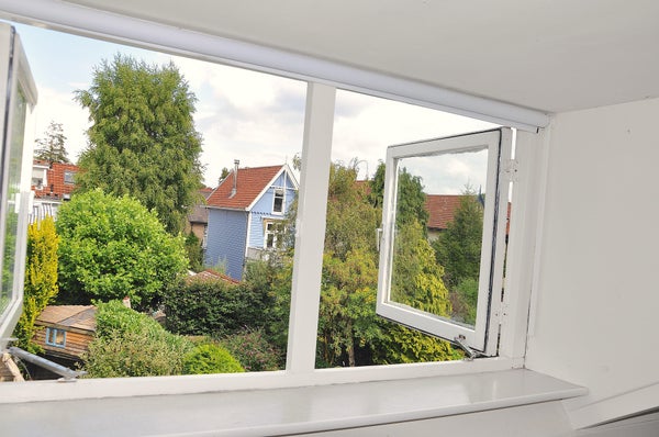 Deep (19 meters), lush garden overlooking the charming “Pippi Longstocking” houses of Sandtmanlaan. Includes lots of plants, two sunny terraces: one near the kitchen with a wooden bench for morning coffee, and a second lounge area in the back with a large wooden sofa and wood stove – perfect for enjoying the sun during the day and early evening.