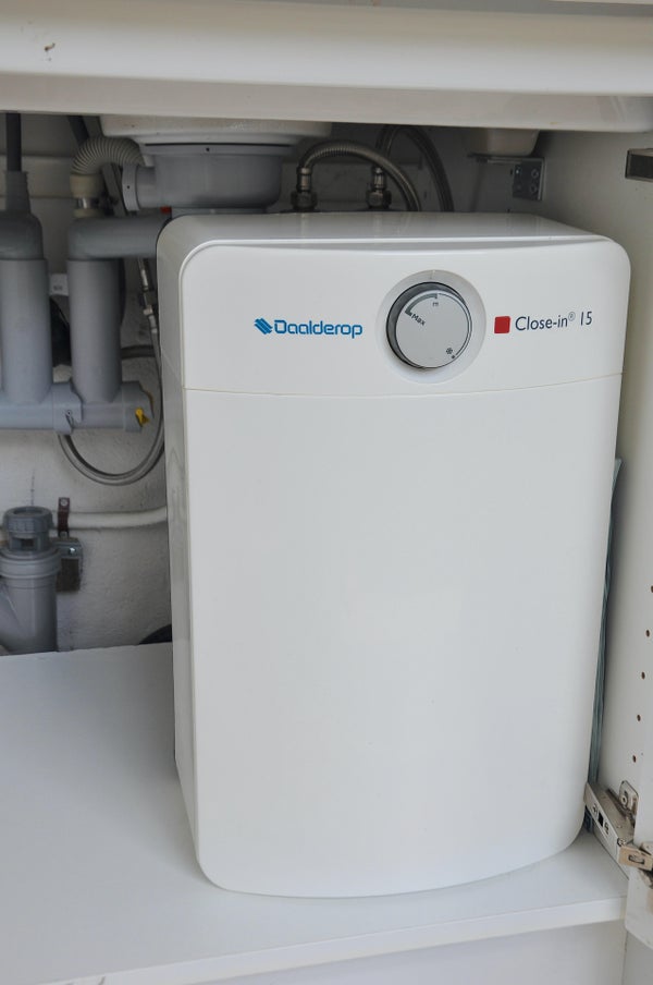 The kitchen is modern and bright with laminate flooring and underfloor heating, a hot water boiler, generous wooden countertop with plenty of drawer space, 6-burner gas stove, oven, dishwasher, fridge/freezer, washing machine, and dryer. A second door (with cat flap) opens to the backyard.