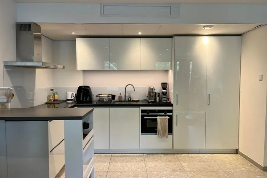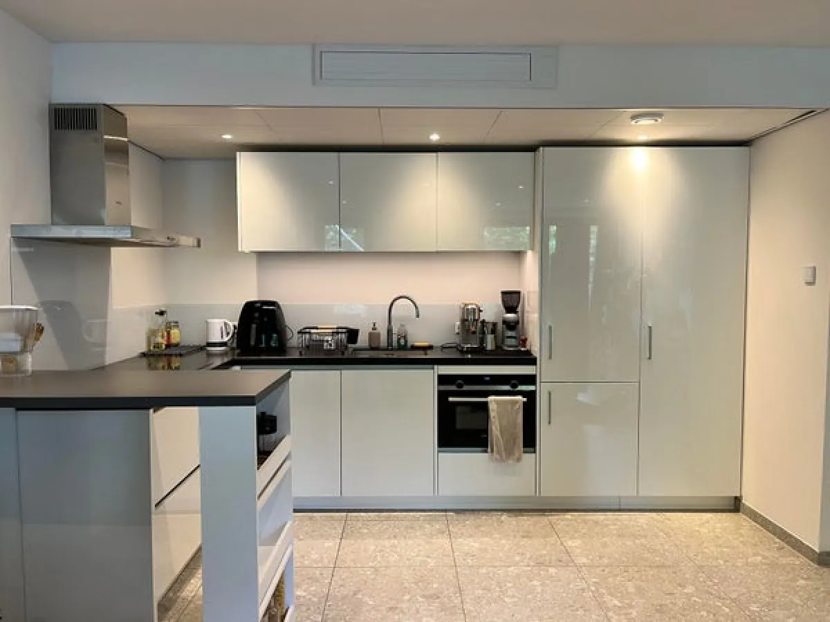 Keuken: Quooker, vaatwasser, combimagnetron, inductiekookplaat, koel- vriescombinatie, composiet keukenblad, Siemens keukenapparatuur.