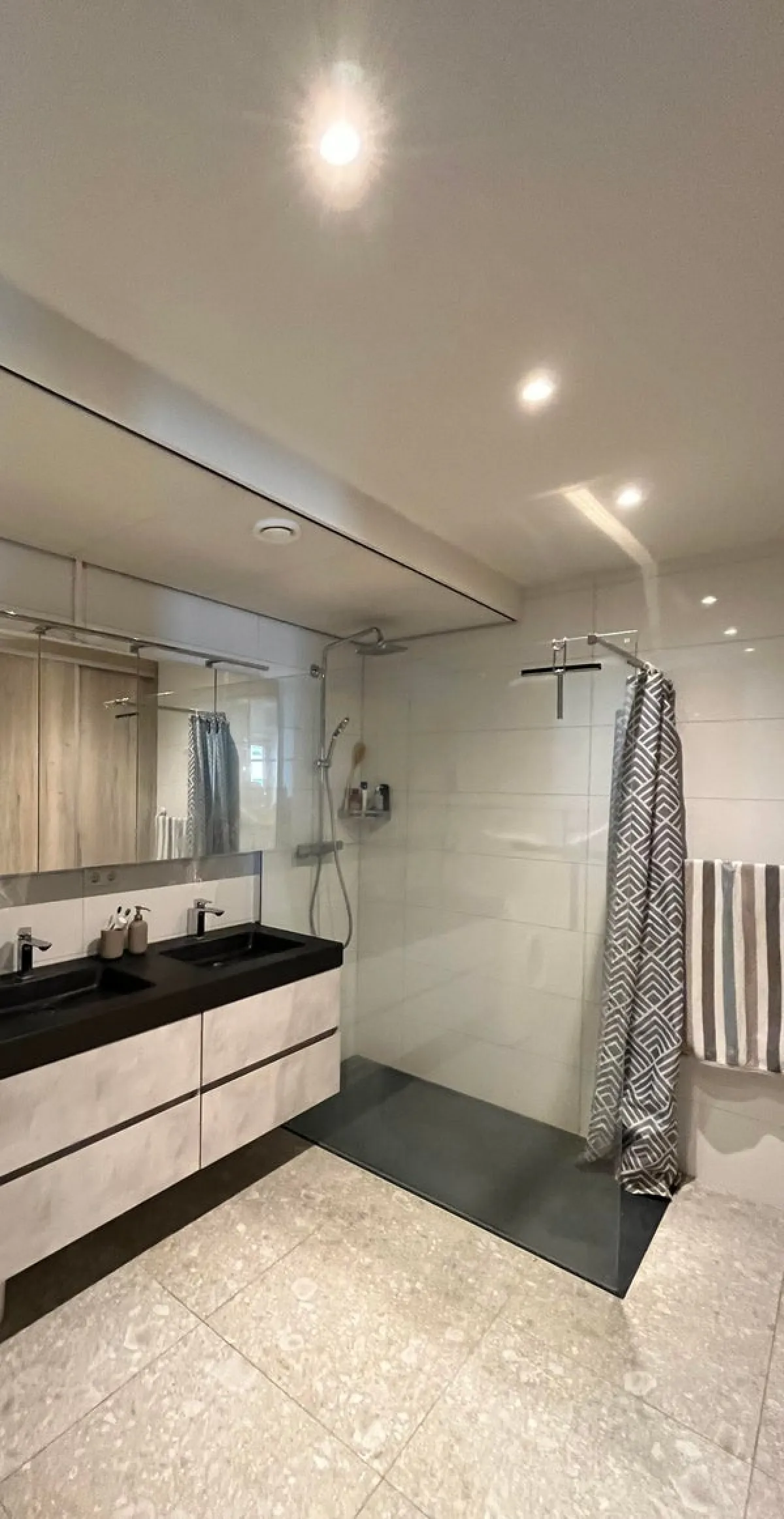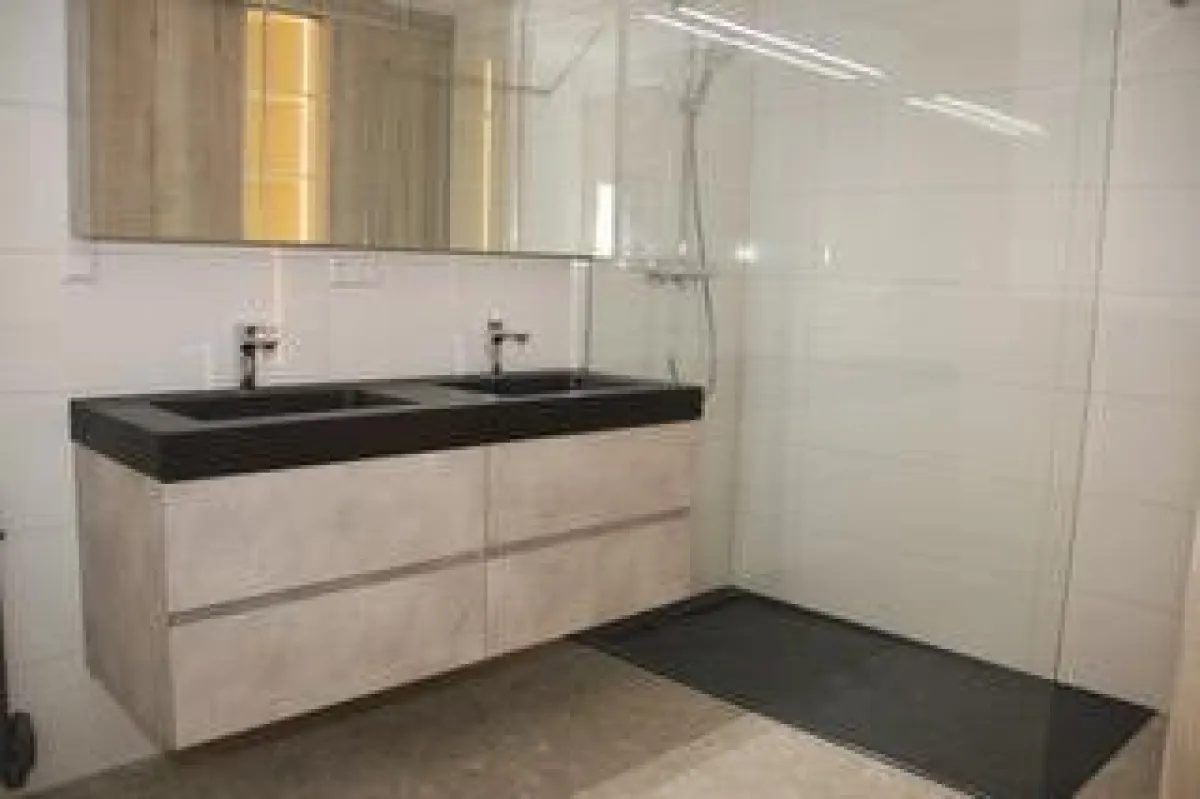 Badkamer: ruime inloop douche, 2 wastafels, spiegelkast, inbouwspots led en aansluiting wasmachine en droger