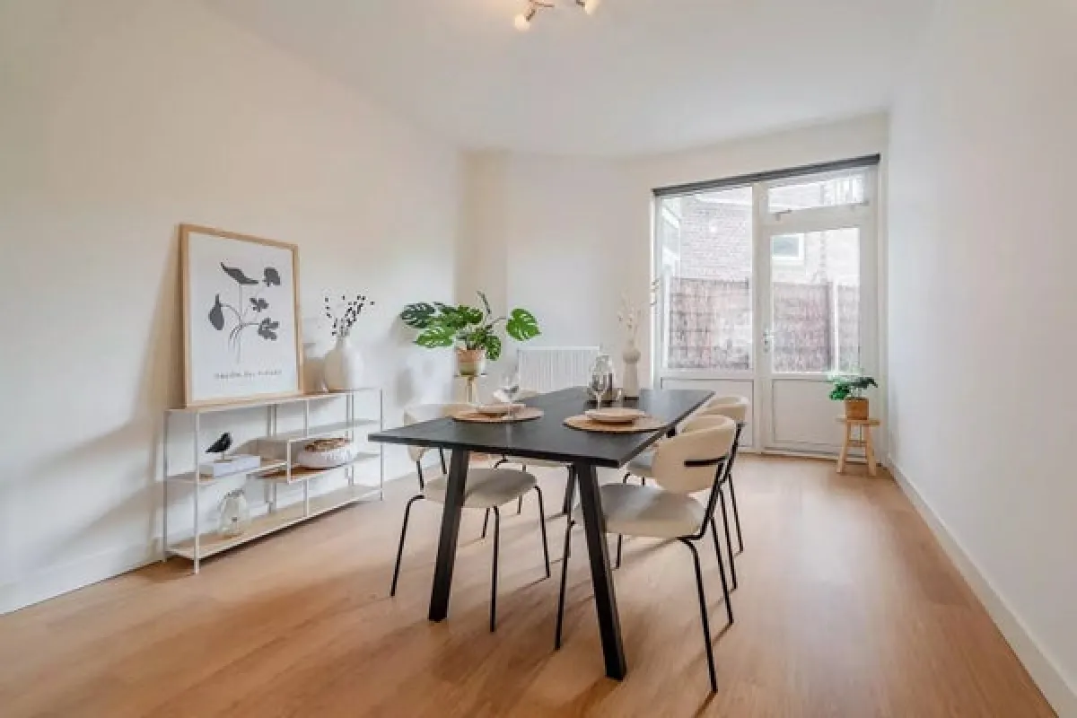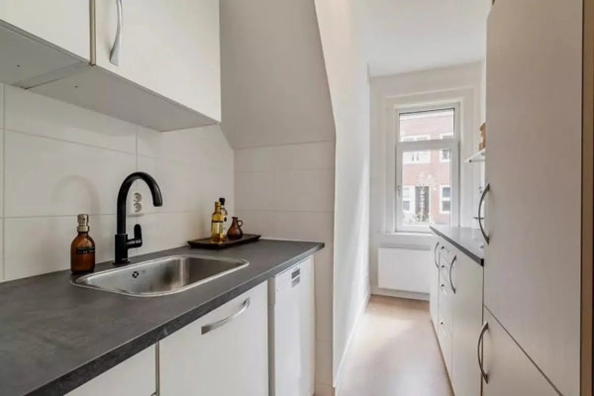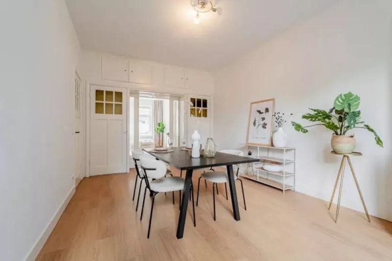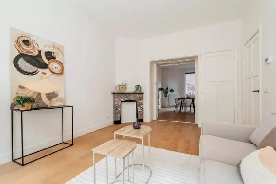 From the classy entrance you enter the vestibule which allows you to enter all rooms in the apartment. The apartment has a nice wooden floor and several built-in closets. The modern kitchen on the front of the house is equipped with a gas stove, oven, dishwasher and freezer/refrigerator. The spacious and light living room is divided by the original en-suite doors and is laid out from the front to the back of the house, where the entrance to the back yard is. The large bedroom is also located at the back of the house and has doors to the backyard too. The modern, new bathroom has a toilet, design radiator, sink, washing machine and a large shower. The apartment is heated by a central heating system.