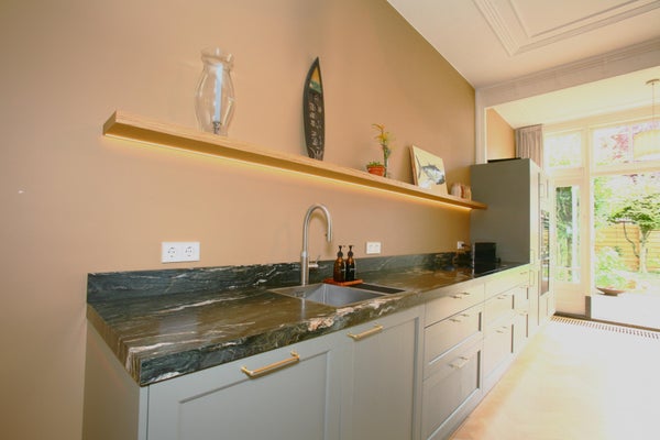 Via de voordeur bereikt u het voorportaal met tussendeur. Erachter bevindt zich de gang met direct rechts, een fraai toilet met wastafel. Aan de linkerkant bevindt zich een chambre en suite met schuifdeuren. De woonkamer bevindt zich aan de voorkant. Deze heeft een mooie schouw met houtkachel, waarmee je de etage sfeervol en heerlijk kunt verwarmen terwijl de eetruimte met een mooie moderne open keuken aan de achterzijde bevindt. Vanuit de woonkamer kunt u de prachtig onderhouden tuin met terras bereiken. Achter in de tuin bevindt zich een schuur met tuinspullen.