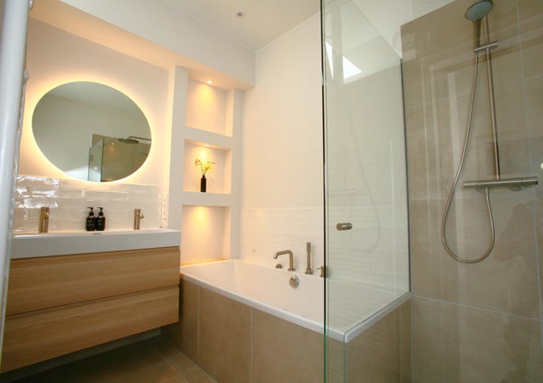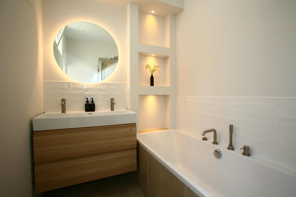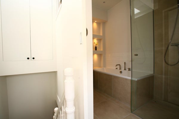 Op de begane grond, aan de achterzijde, bevindt zich een kamer met uitzicht op de tuin met rechtsachter, de masterbedroom die via openslaande deuren toegang verschaft tot de achtertuin. Hiertussen bevindt zich een fraaie badkamer met douche cabine, een moderne wastafel en verwarmde spiegel met backlight.