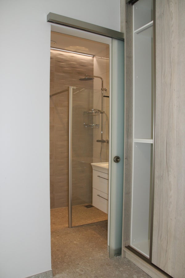Badkamer: regen douche, wastafel en spiegelkast