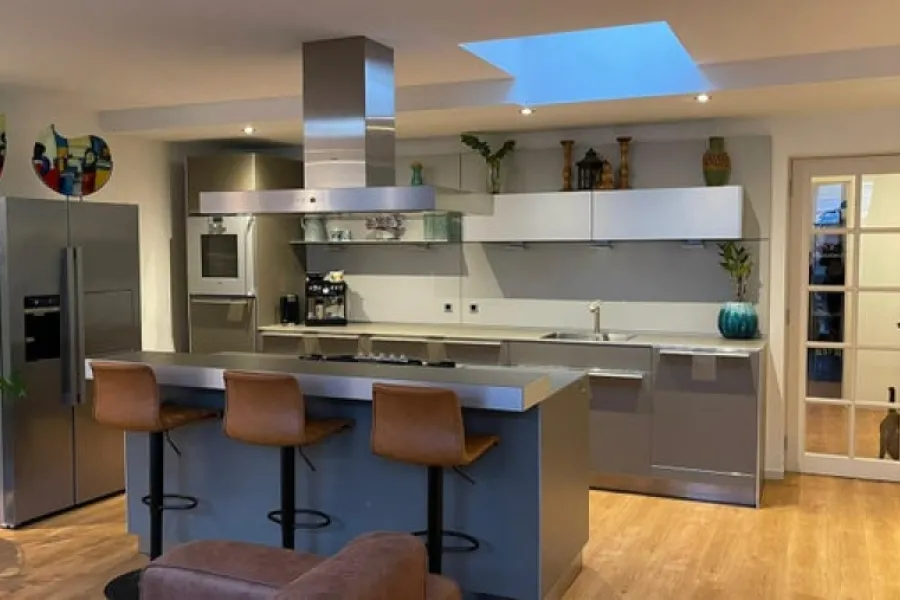 -Ruime, luxe Bulthaup-woonkeuken met kookeiland en lichtkoepels