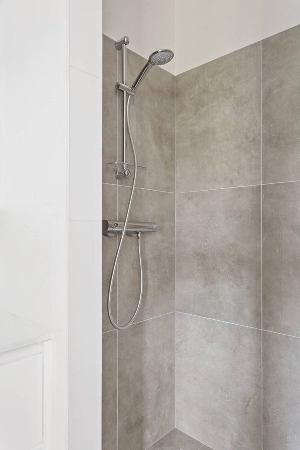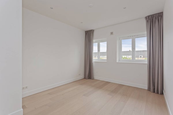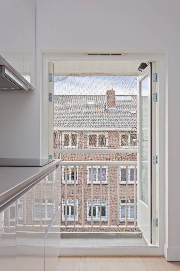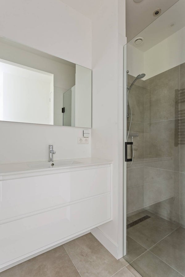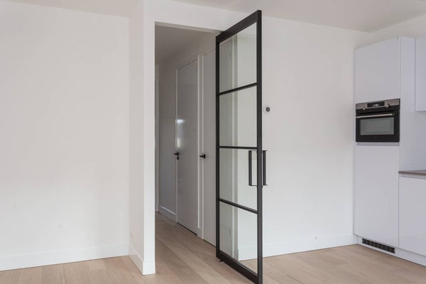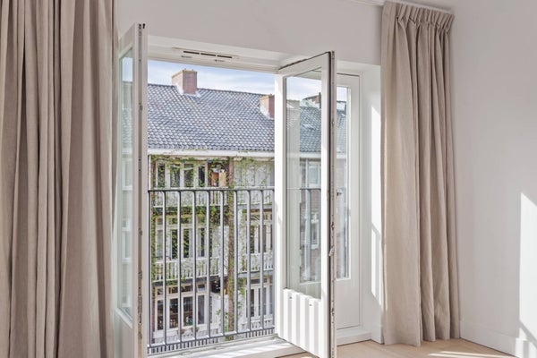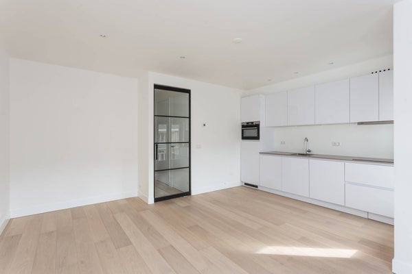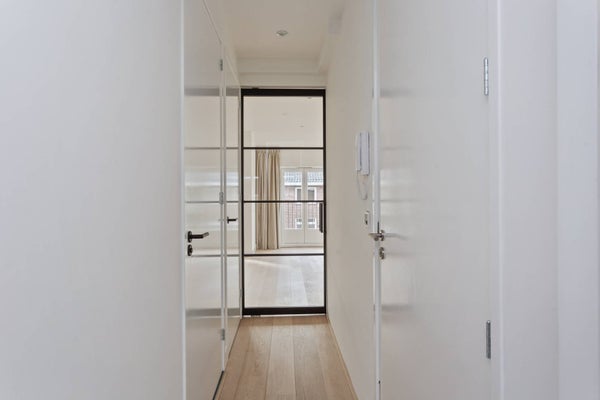 Through the updated communal staircase you will find the entrance of the apartment on the fourth floor. The hallway gives access to the rooms. At the back of the apartment you will find a bright and spacious living room with open kitchen and a French balcony facing South. The kitchen has all the necessary new appliances such as a dishwasher, fridge, oven/microwave combination and an induction cooker with hood. Here you will find also a small balcony facing south. In the front there is the bedroom with a connecting open bathroom with sink, designradiator, walk-in shower and mechanical ventilation. Additionally there is a separate toilet and a separate laundry facility present.