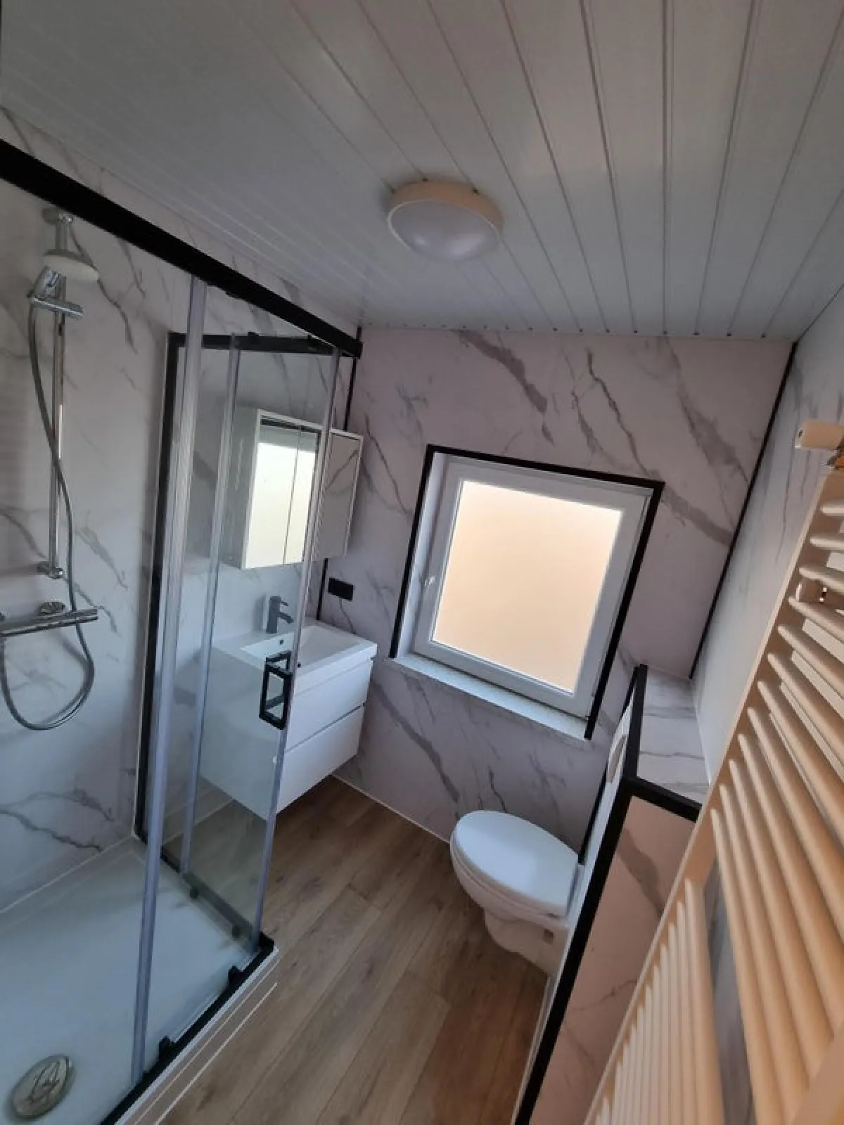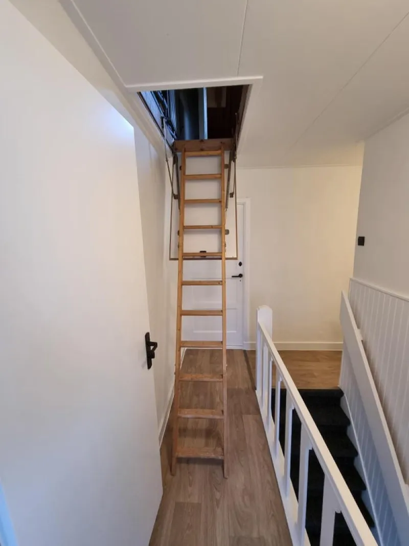 Drie ruime en lichte slaapkamers voorzien van tapijt, een moderne badkamer met douche, wc, wastafelmeubel en spiegelkast, vlizotrap naar de zolder.