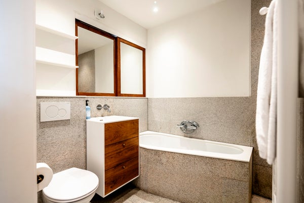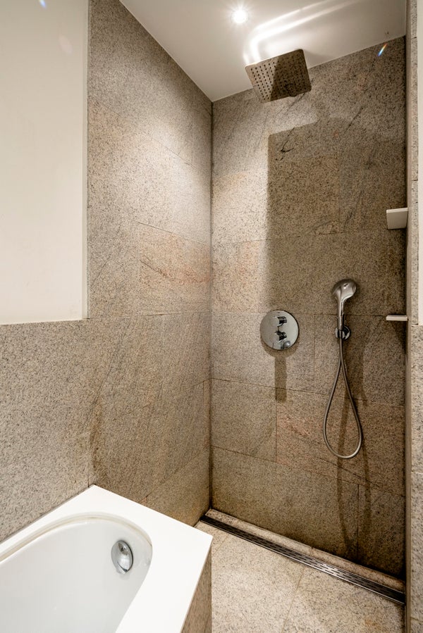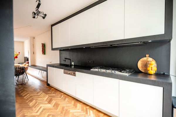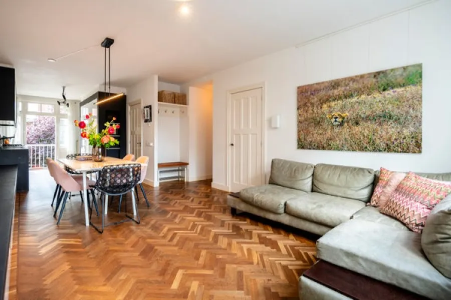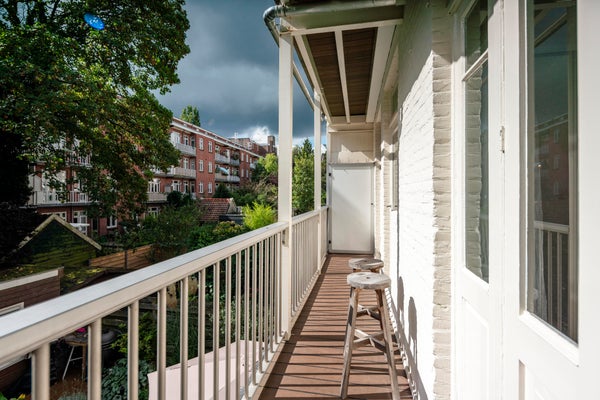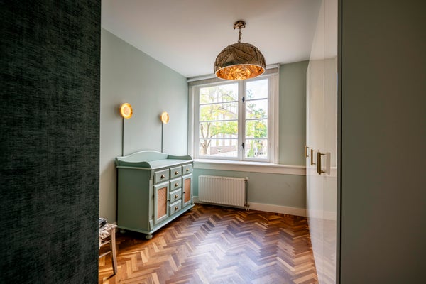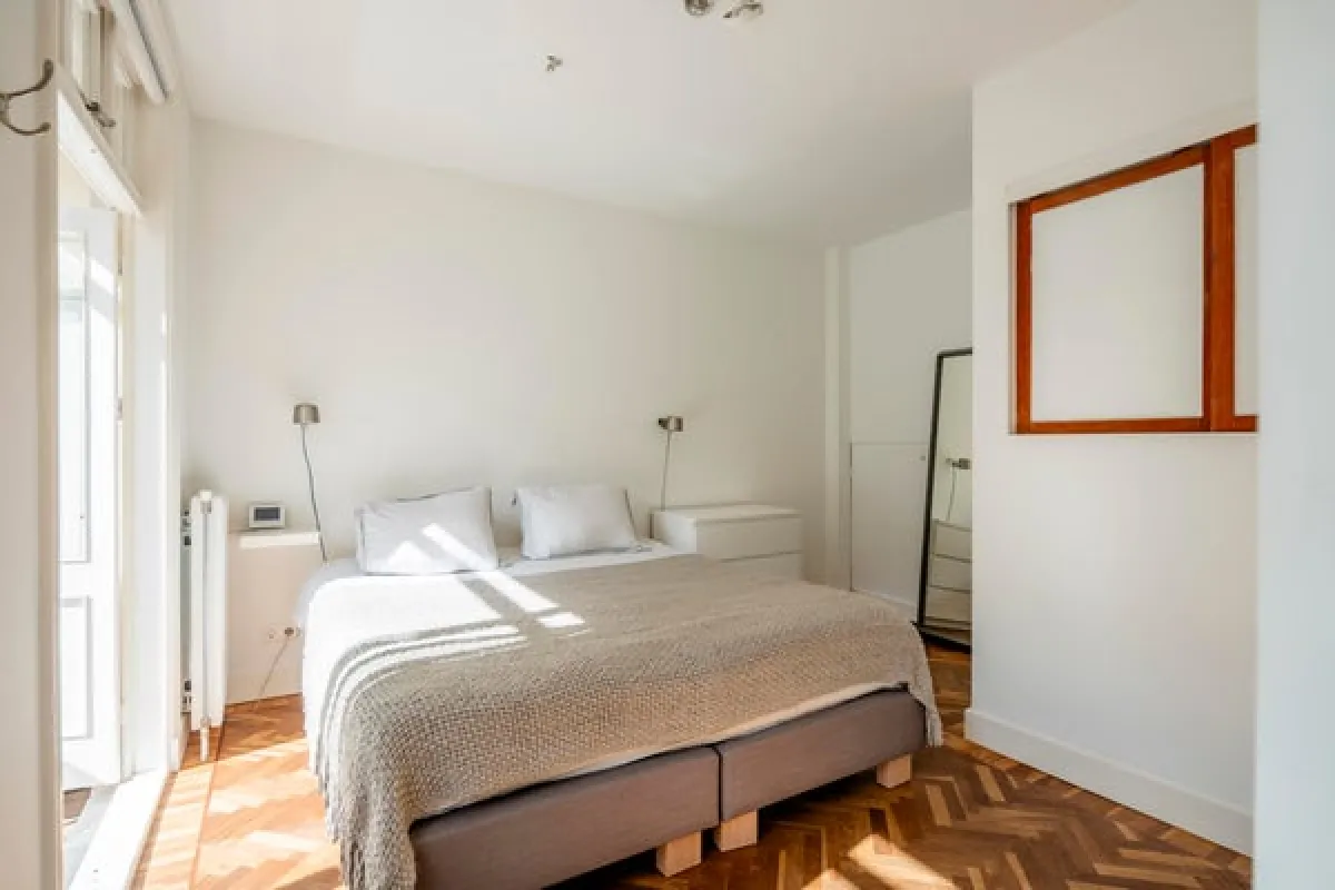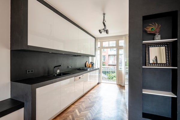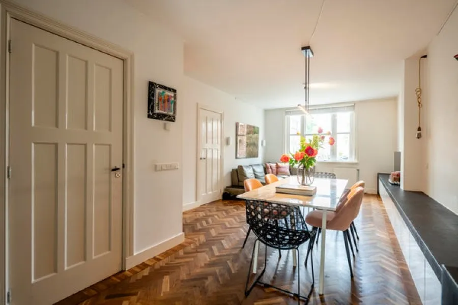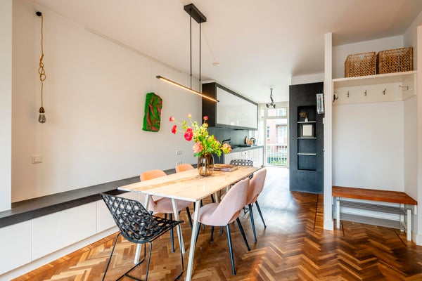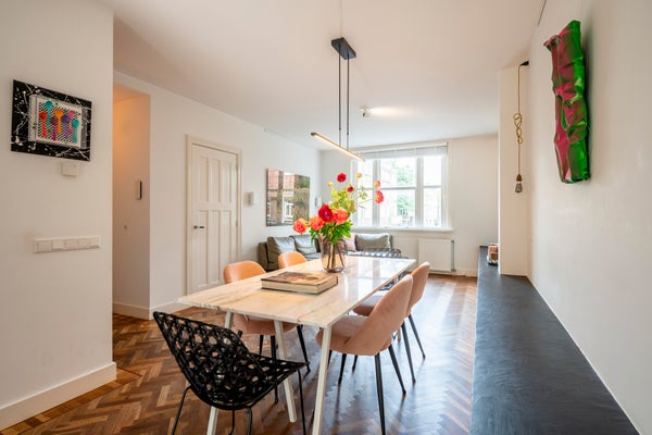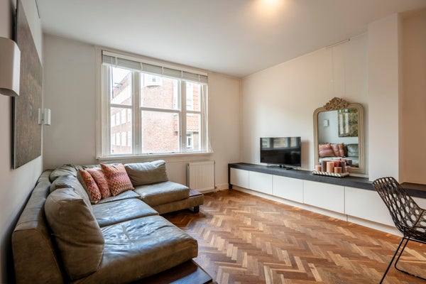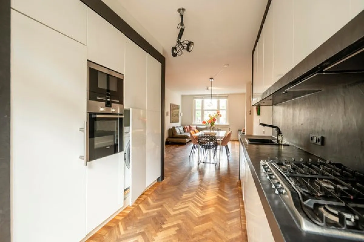 On the first floor the private entrance features a herring bone oak wooden floor and wardrobe space. The living room is bright and spacious and has an open modern kitchen. The kitchen is equipped with modern built-in appliances such as a gas stove, oven, microwave and dishwasher. The modern bathroom has natural stone tiles and features a bathtub and separate shower. The apartment has two well-proportioned bedrooms (one main bedroom and a second bedroom NB current situation is a double bed, this bed is not in the pictures), is cleverly designed to make optimal use of the space and offers loads of build-in cabinet space.