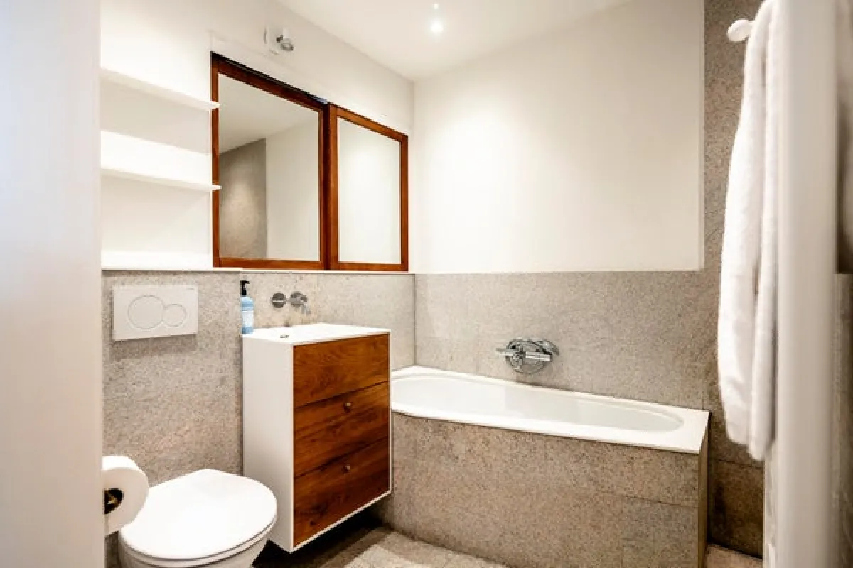 The sunny south-facing balcony stretches along the full width of the apartment back-side and is accessible from the kitchen and the main bedroom.