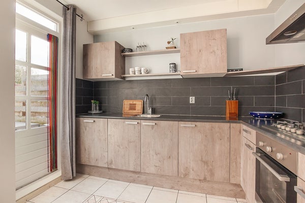 Entree/hal met meterkast en toegang tot de ruime woonkamer aan de voorzijde, open trap naar eerste verdieping, deur naar tussenhal met keurig toilet en het eetgedeelte aan de achterzijde. De half open keuken bevindt zich aan de achterzijde en is v.v. een moderne hoekopstelling 2018 met diverse inbouwapparatuur o.a. 5 pits gaskookplaat, afzuigkap, oven, koelkast, vriezer, vaatwasser en spoelbak. De woonverdieping is v.v. een nette plavuizenvloer en keurig afgewerkte wanden. Vanuit de keuken is er toegang tot het heerlijk ruime terras van 25m2 met moderne vlonders.