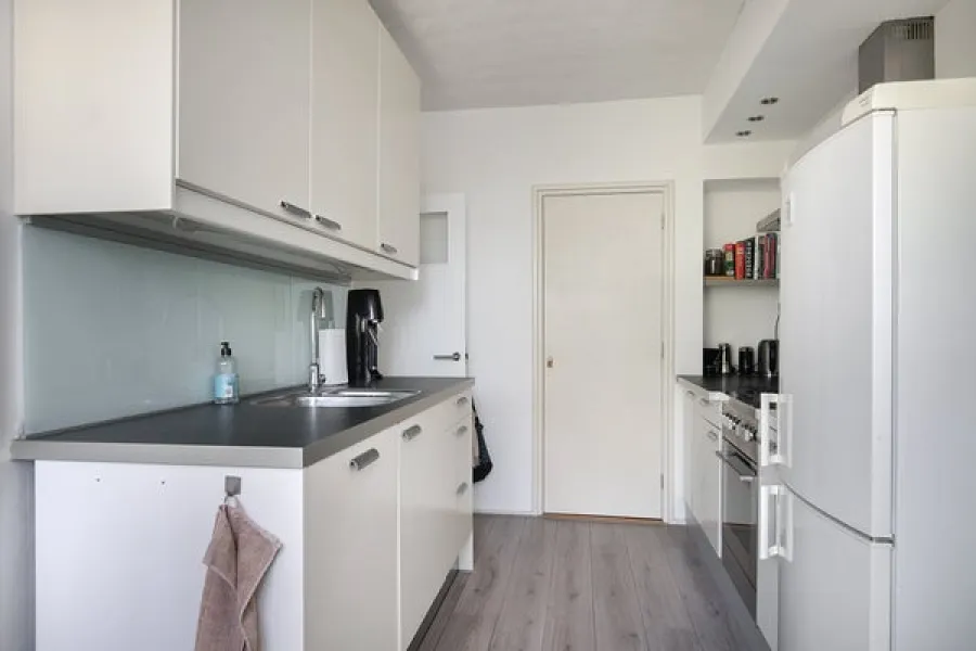 Well-maintained communal entrance, via stairs to the second floor. Through the hall with separate toilet, access to the spacious living room with a wood laminate floor. Through the hall also access to the closed kitchen with built-in appliances, including a 4-burner gas hob and oven, extractor, dishwasher and separate fridge and freezer with sufficient storage space. Access to the balcony through the kitchen door.